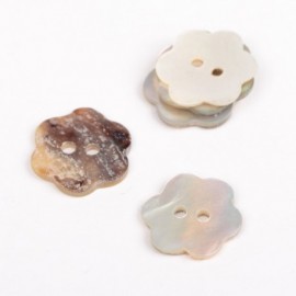 Botón de nácar con forma de flor, en color blanco, con dos agujeros y 15 mm de diámetro.
