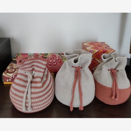 Puedes elegir los colores de los ovillos de entre los disponibles de DROPS Cotton Light, indícalo en los campos de personalización de más abajo. Los colores por defecto son el 21 - beige claro (2 ovillos) y el 35 - cobrizo (1 ovillo), colores utilizados en los saquitos de las fotos.