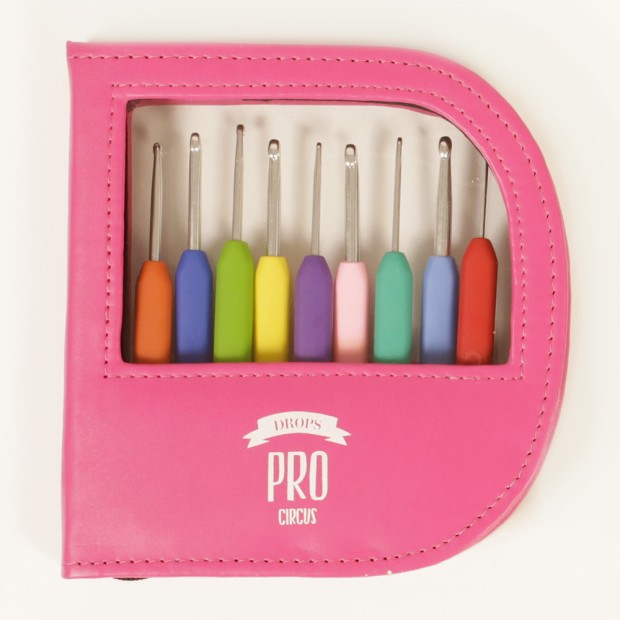Estuche de agujas de ganchillo ergonómicas DROPS Pro Circus, con 9 agujas de ganchillo ergonómicas.