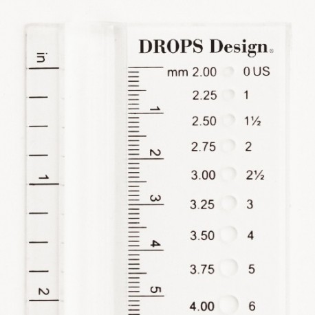 Measuring tool for needle sizes 2.00mm (US 0) to 12.00mm (US 17).