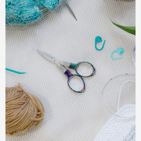 Small folding scissors (length about 11.5cm when unfolded) to take anywhere. They come with a pretty fabric case with floral motifs from the Mindful collection. With Rainbow finish, multicoloured metal.