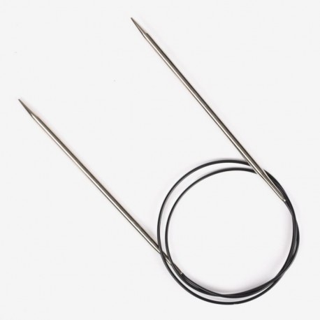 Shiny circular needles with pointed tips, perfect transitions and flexible cables, very comfortable to knit with.