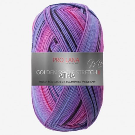 Golden Socks de PRO Lana de 4 hebras, lana para calcetines y otros usos, lavable en lavadora con efectos de color, en su edición Ätna, inspirada en los colores del volcán Etna. En ovillos de 100g/400 m aprox, para aguja recomendada de 2.5 a 3.5mm