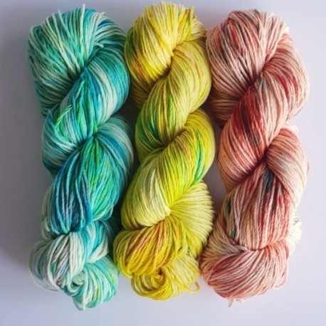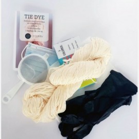 - madeja de algodón L de 100g/200m - 3 tintes - pincel - cuchara - guantes - mascarilla - recipiente para teñir e instrucciones