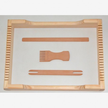 A comb, a small shuttle and a stick are included to facilitate the passage of the shuttle through the warp.