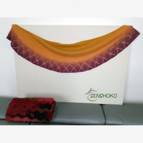 Los dos chales de las fotos están realizado con los colores de Poema 07 - Barbosa da Bocage y 09 - Cesareo Verde, puedes utilizar cualquiera de los colores de Poema o realizarlo con otro hilo si lo deseas (ten en cuenta las características del hilo utilizado, el recomendado presenta un color con efecto degradado que combina muy bien con el diseño).