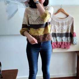 Se realiza en tricot (2 agujas), el modelo original está elaborado en DROPS Belle, de grosor 8ply/DK/Worsted. Puedes ver las características de estes hilo en el link siguiente: