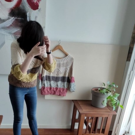 Se teje con agujas circulares de 3,5 y 4mm y tamaños de cable de 40, 80 y 100cm.