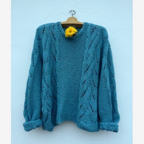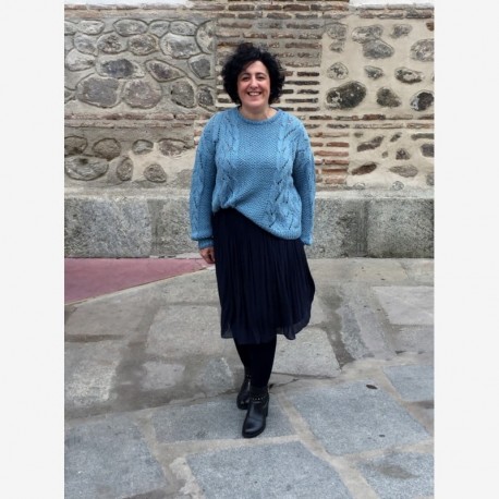 Patrón descargable en formato PDF para tejer en tricot (dos agujas) el Sweater Blue Moon, diseño de @olgamnp, bonito y original jersey tejido en punto arroz con calados y trenzas.