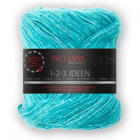 1-2-3 Ideen da Pro Lana, fio 100% algodão egípcio com um degradê delicioso. Cada novelo começa e termina no mesmo tom. Numa novelo de 100g/315m aprox., para uma agulha recomendada de 3 a 4mm.