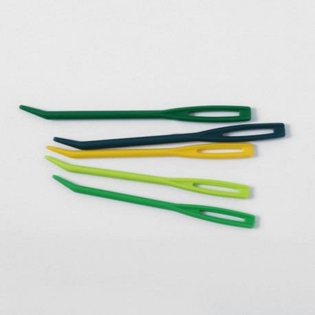 Set de 4 agujas laneras en plástico, en colores surtidos, y en dos medidas distintas: 9cm. y 7.5cm aprox. Agujas con punta roma y en curva, para coser con más facilidad. Adecuadas también para Tapresty.