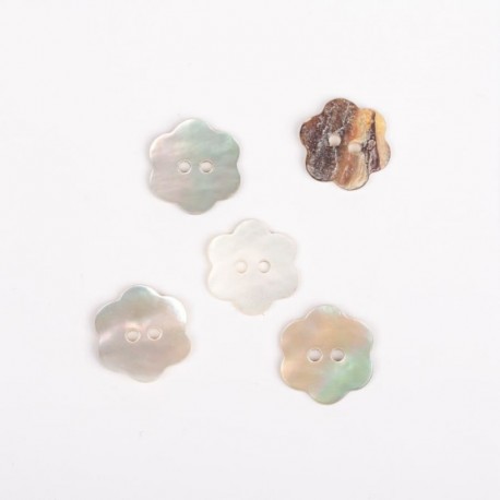 Botão em forma de flor de 15 mm em nacar, com 2 orifícios, de cor branco.