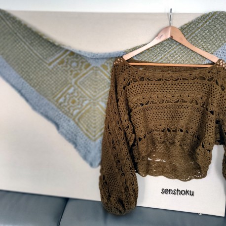 Kit para fazer crochê do top Dash, design Senshoku, um suéter de mangas largas com um resultado espetacular, o padrão funciona para os tamanhos M e L, é o mesmo, com um resultado mais justo no caso do tamanho L. É feito em crochê com lana de espessura de dedilhado (Shetland de Casasol). O desenho original é feito na cor 04 – topázio marrom, você pode ver a descrição e cores disponíveis deste fio no link a seguir: