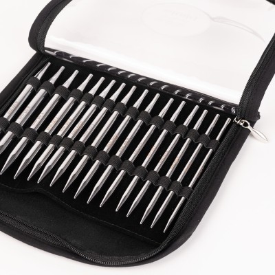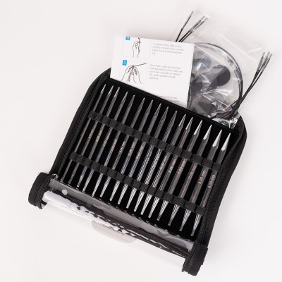 O conjunto de agulhas circulares Dropss Pro Spark é um conjunto versátil e de alta qualidade. Inclui chaves para cabos e um pequeno manual de instruções (em inglês). Vem numa prática caixa de nylon preta com frente de plástico transparente.