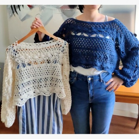 Padrão para download com instruções para fazer crochê do top Dash em versão algodão, desenhado por Senshoku, um suéter de mangas largas com resultados espetaculares. O padrão serve para os tamanhos S, M e L/XL. É tricotado com fio de espessura DK/Worsted e com agulha de 5mm. O desenho original é feito em duas versões, uma com Casasol Bamboo e outra com Eco Denim, também da Casasol, você pode ver a descrição e cores disponíveis deste fio nos seguintes links: