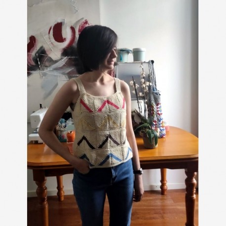 Confeccionada em tricot (2 agulhas), o modelo original é confeccionado com Safran, fio 100% algodão com espessura de 5 camadas/esportiva. Você pode ver as características e cores disponíveis deste fio no seguinte link:
