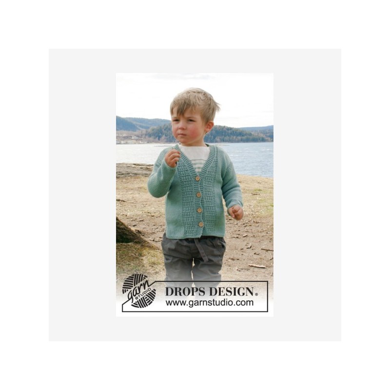Chaqueta de punto con patrón estructurado, escote en V y abertura en los lados en DROPS Cotton Merino. Tallas 0 - 6 años.