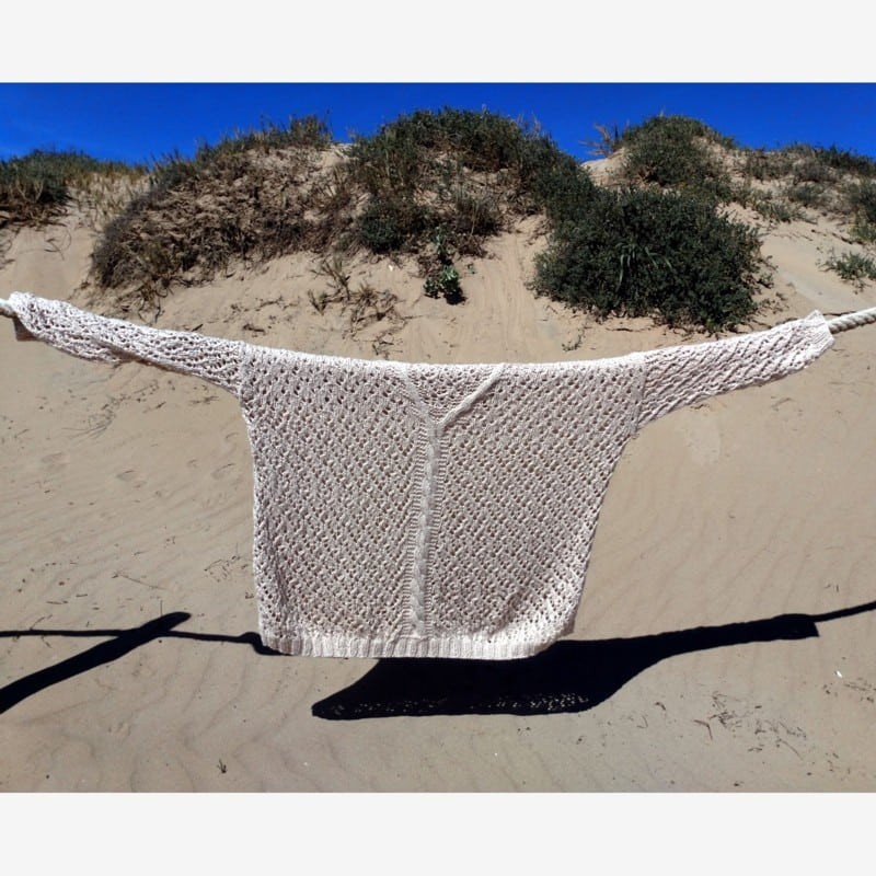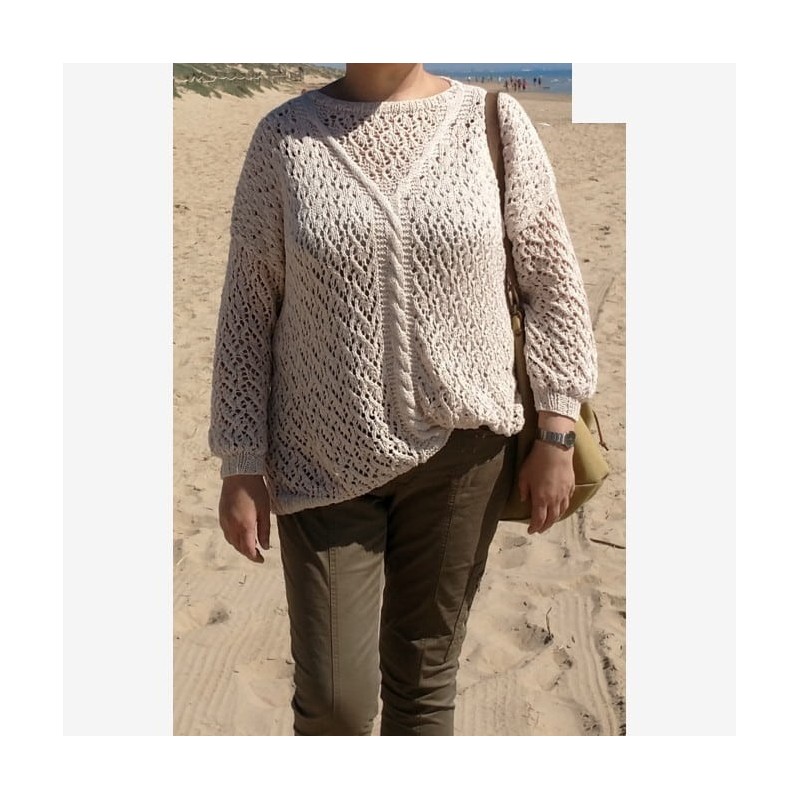 El jersey es ancho (oversized), no ajustado al cuerpo y puede utilizarse este mismo patrón para tejerlo en talla M o en talla L/XL, utilizando distinto tamaño de agujas (4 o 5 mm, respectivamente).